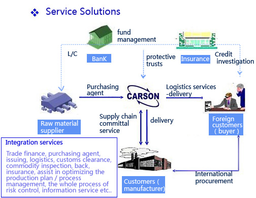 | 6.Financial Services of SC | Control the capital stream and goods flow of the related industries effectively. According to the different financing needs from suppliers, dealers and end users in supply chain, we provides many service such as L/C to buy out, credit sale to buy out, delivery and financing, hedge foreign currency , etc. |